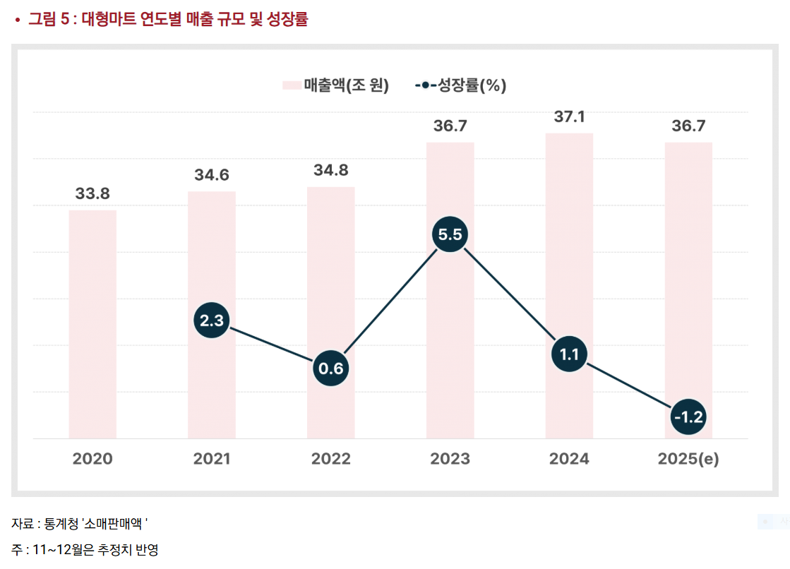 전체 대형마트 시장은 올해 역성장이 예상됩니다. 백화점·편의점·온라인쇼핑몰이 상반기 대비 하반 기 실적이 개선된 것과 달리, 대형마트는 하반기 들어 더 큰 부진을 겪었는데요. 1~2인 가구 증가에 따른 대형점 이용 감소, 온라인 채널로의 이동 등 기존 요인 외에도 3월부터 기업회생 절차에 돌입한 홈플러스 사태, 6월 이후 지급된 민생회복소비쿠폰 사용처 제외 등 악재가 겹치며, 힘겨운 한 해를 보냈습니다.