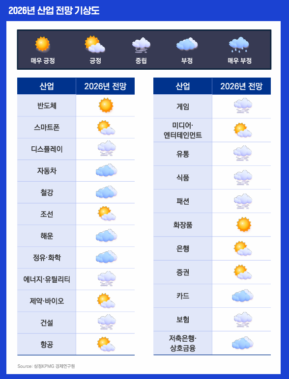 2026년 국내 주요 23개 산업의 기상도를 살펴보면, 반도체와 화장품은 ‘매우 긍정적’, 스마트폰, 조선, 제약·바이오, 항공, 미디어·엔터테인먼트, 은행, 증권 등 7개 산업이 ‘긍정적’인 업황을 맞을 것으로 기대됩니다. 한편, 디스플레이, 에너지·유틸리티, 건설, 게임, 유통, 보험 등 8개 산업은 ‘중립’, 자동차, 철강, 해운을 비롯한 6개 산업은 2025년보다 성장세가 다소 둔화할 것으로 예상됩니다.