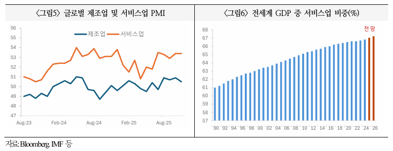 ㅇ (무역) 서비스 부문은 상대적으로 견조한 반면 상품 부문이 선수출 종료 등 기술적 요인에 저성장, 자체조달 증가 등 구조적 요인도 가세하여 크게 둔화(25년 2.4%→`26년 0.5%)
