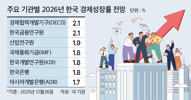 한국금융연구원은 금융 여건 완화와 정책 효과를 반영해 보다 높은 2.1%의 경제성장률을 제시했다. 경제협력개발기구(OECD)도 같은 전망치를 내놓으며 한국 경제가 2025년을 저점으로 2026년에는 완만한 반등 국면에 들어설 것이라고 평가했다. 이밖에 주요 기관의 2026년 경제성장률 전망치는 산업연구원 1.9%, 아시아개발은행(ADB) 1.7%, 국제통화기금(IMF) 1.8% 등이다.