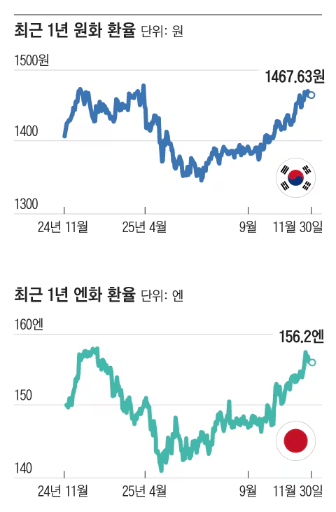 원화와 엔화는 올해 내내 거의 비슷한 곡선을 그렸다. 달러 대비 원화 환율은 올해 초 비상계엄 여파로 1470원 선에서 시작했다가 6~7월에 새 정부가 들어서면서 1350원 선까지 내려왔다. 그러다 지난달부터 강달러 영향에 따라 1400원을 훌쩍 넘어섰다.