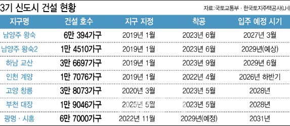 @왕숙·교산·창릉 등은 2019~2020년 지구 지정 이후 5~6년이 지난 2024년에야 착공이 이뤄졌다. 이에 따라 최초 입주 시점도 2028~2029년으로 잡혀 있다.