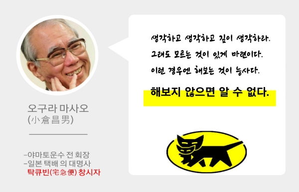 ⊙해보면 알 수 있다. 하지 않으면 알 수 없다. (japanoll.com) •이름: 오구라 마사오(小倉昌男) •경력: 야마토운수(ヤマト運輸) 전 회장, 야마토 택배 ‘탁큐빈’ 창시자 •태생: 도쿄 •생몰연도: 1924~2005 “임자~해보긴 해봤어”. 현대그룹 창업주인 고 정주영 회장이 생전 자주 했던 말이다. ‘안된다고 말하지 말고 일단 도전해 보라’는 의지를 강조한 것이다. 일본에도 이와 비슷한 말을 전파한 경영자가 있다. 야마토운수를 중흥시킨 오구라 마사오(小倉昌男) 전 회장이다. 오구라 마사오는 일본 택배의 대명사인 탁규빈(宅急便) 창시자로, 일본 물류산업을 변화시킨 전설의 경영자다. ‘구로네코’(검은 고양이) 브랜드의 야마토운수는 전후 40년간 일본 제1의 택배회사로 성장했다.(일본 운수/택배..