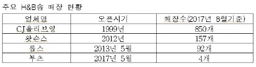 씨제이(당시 제일제당)가 1999년 드럭스토어 형태의 올리브영 1호점을 개설한 이후 20년, 헬스앤뷰티(H&B)스토어와 드럭스토어 매장이 1,700곳에 육박한 것으로 나타났다.