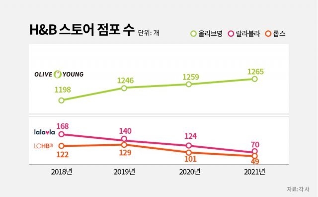 한편 H&B스토어 업계 2위 랄라블라는 지난해 매장 180곳을 운영하며 매출 1,728억 원을 달성했다. 그러나 실적 부진으로 인해 영업손실 254억 원을 내며 마이너스 성장세를 보였다. 올해 경영 내실화를 위해 부진 매장 정리에 나서며 매장 수도 150개로 줄어들었다.