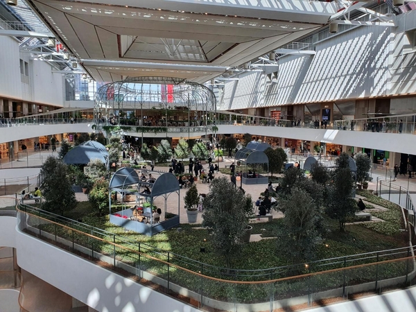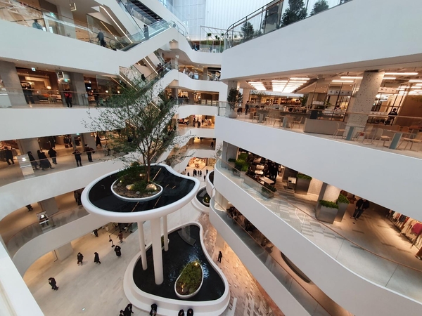 오픈 후 가장 큰 이슈를 끌었던 것은 매장 곳곳에 배치된 친환경적 요소다. 1층에는 12m 높이의 인공폭포 워터폴 가든을 740㎡ 규모로 조성하고, 5층에는 실내 녹색 공원 사운즈 포레스트를 3,300㎡ 규모로 구성해 천연 잔디와 나무, 꽃으로 꾸몄다. 20m 층고의 개방감과 천장의 창문을 통해 들어오는 자연 채광으로 쾌적함을 더했다.