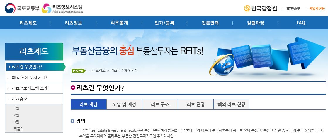 ⊙리츠란 무엇인가? http://reits.molit.go.kr/svc/svc/openPage.do?pageId=010100 리츠(Real Estate Investment Trusts)란 부동산투자회사법 제2조제1호에 따라 다수의 투자자로부터 자금을 모아 부동산, 부동산 관련 증권 등에 투자·운영하고 그 수익을 투자자에게 돌려주는 부동산 간접투자기구인 주식회사임. * 자산을 부동산에 투자하여 운용하는 것으로 법 제3조부터 제8조까지, 제11조의2, 제45조 및 제49조의2 제1항 제2호에 적합하게 설립된 회사 : 자기관리·위탁관리·기업구조조정 부동산투자회사(법 제2조제1호) 「다수의 투자자」 : 영업인가를 받거나 등록을 한 날부터 2년 이내에 발행주식 총수의 30% 이상을 일반인의 청약에 제공(법 제14..